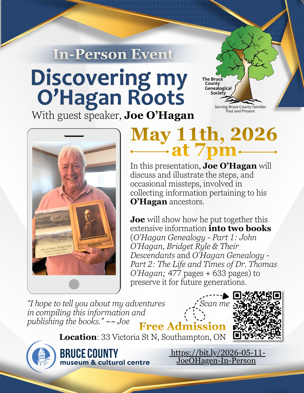 The Bruce County Genealogical Society is delighted to welcome our 2026–2027 Executive and Committee Coordinators. This dedicated group of volunteers shares a passion for family history and community. They are committed to preserving Bruce County’s stories for generations to come.…