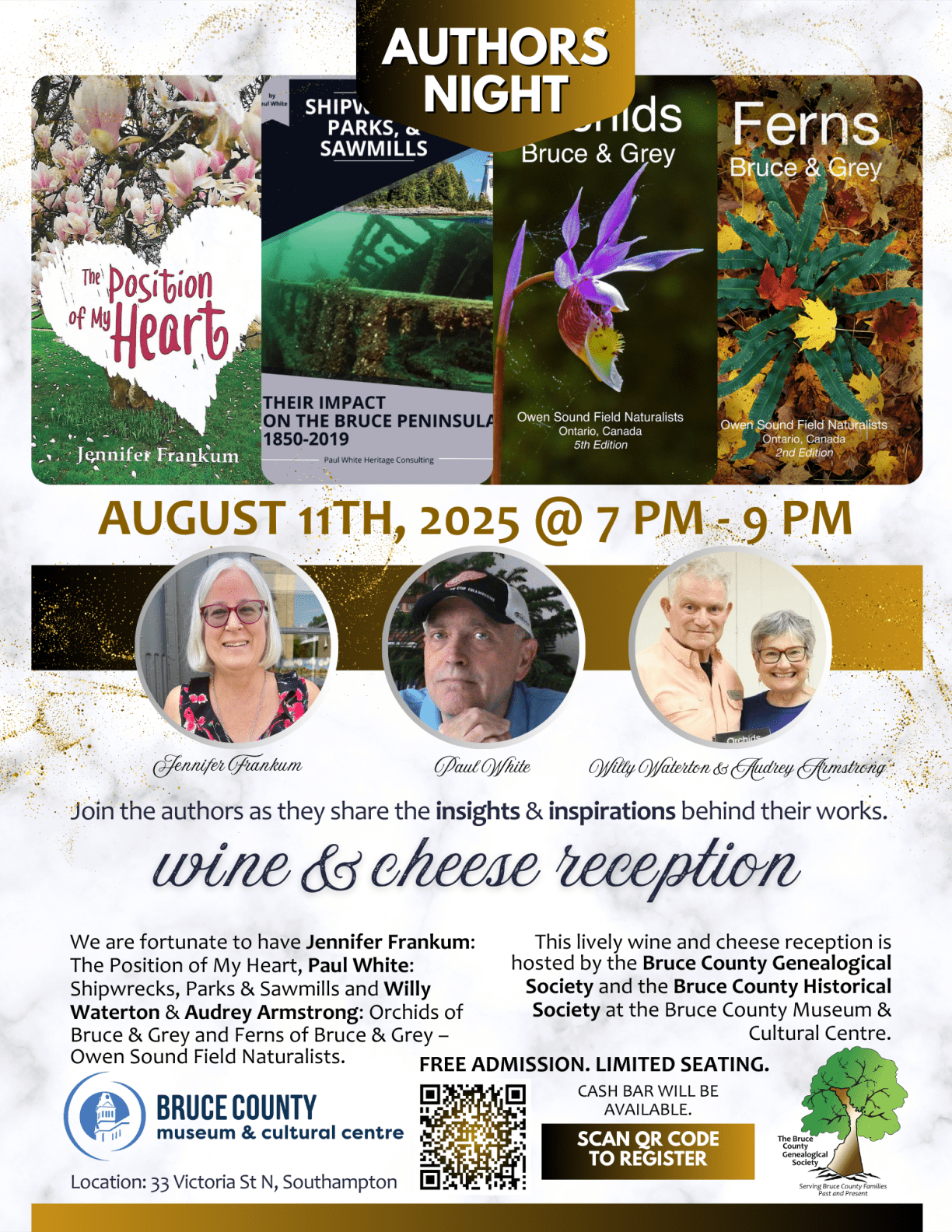 LOCAL AUTHORS NIGHT WITH WINE & CHEESE, 7:00 PM – 9:00 PM – In Person Event. Register HERE: https://www.brucemuseum.ca/event/local-authors-night-with-wine-cheese/